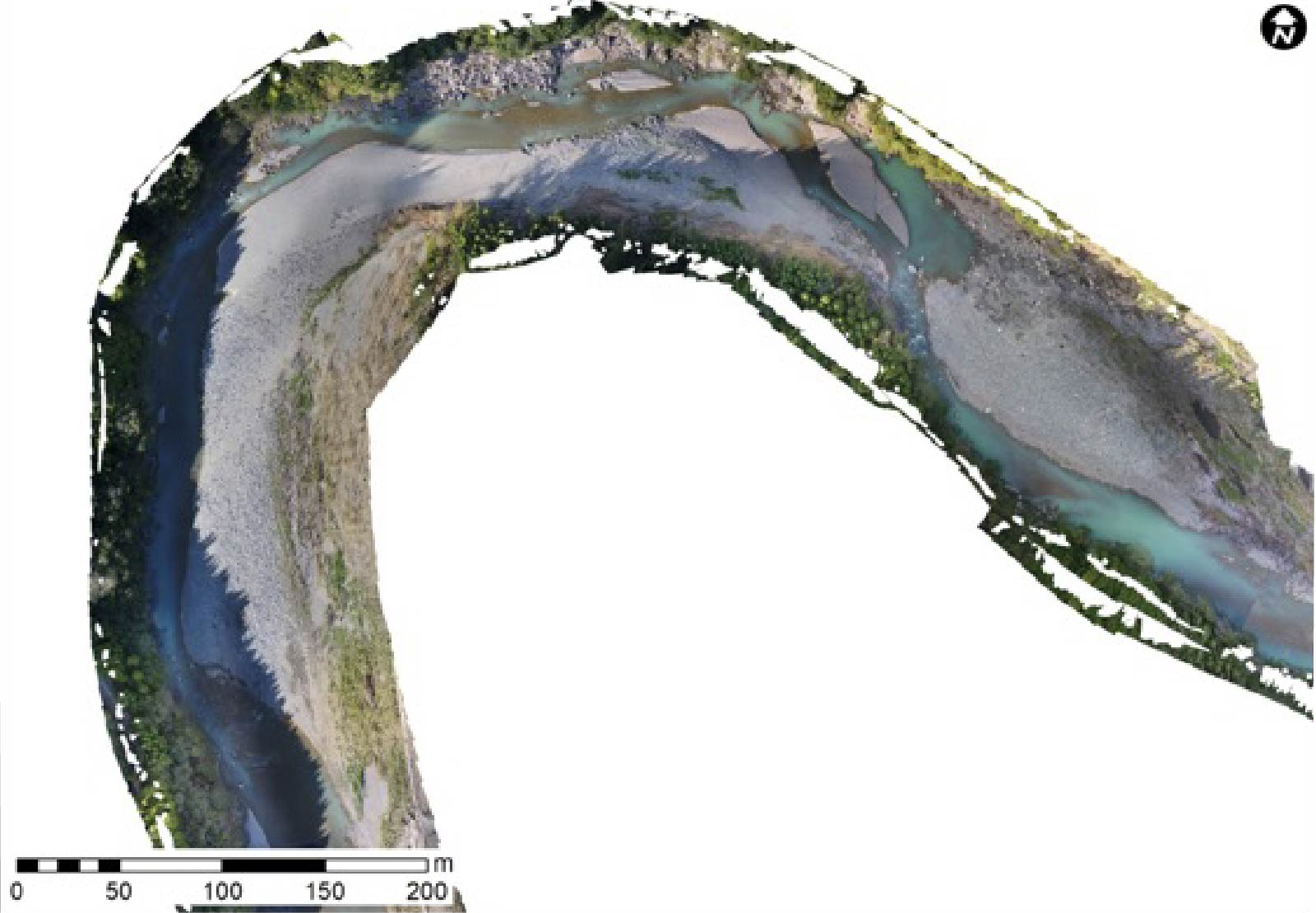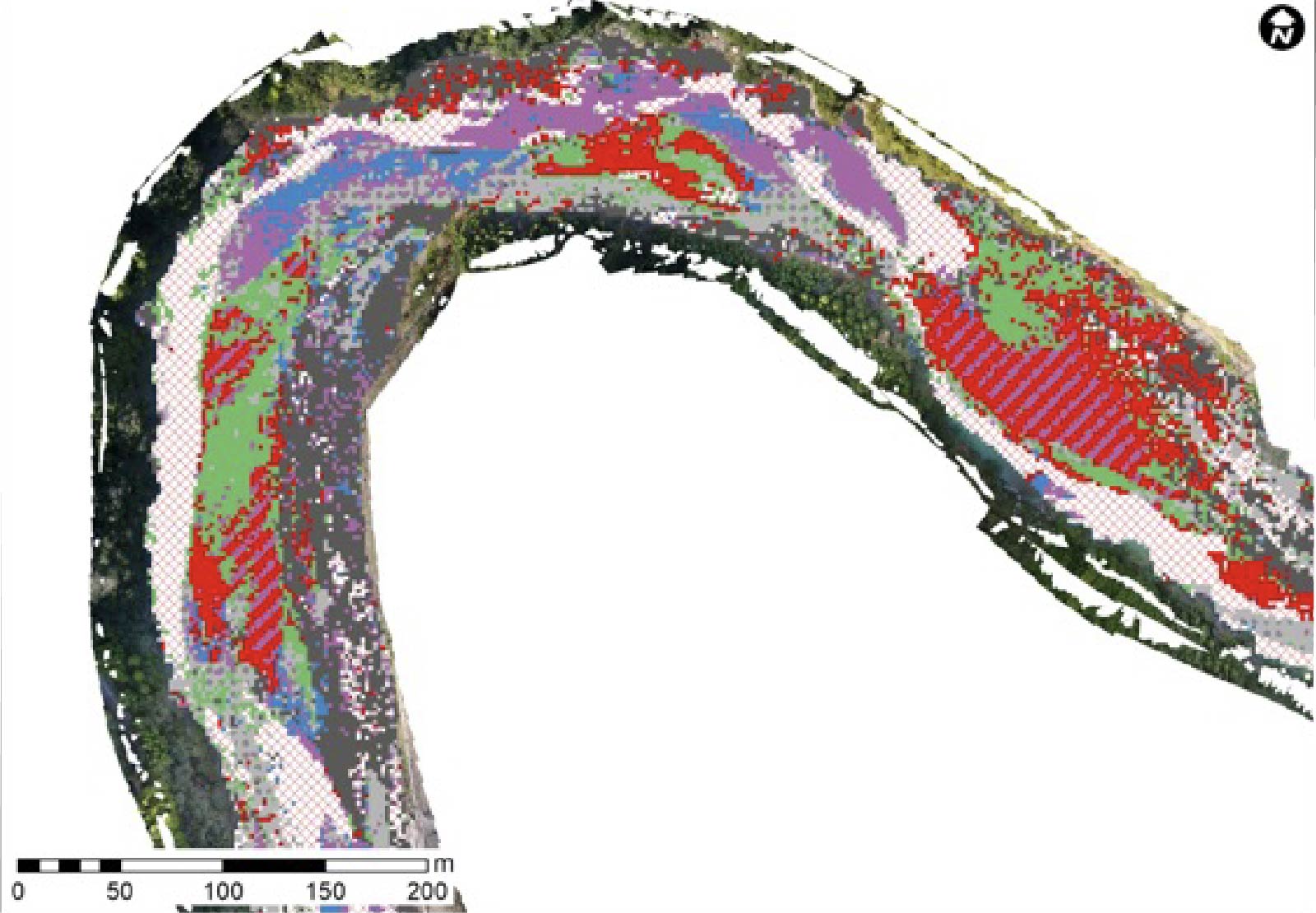 ・そこで、最新の技術を活用し、ドローンによる空撮画像から河床材料を自動区分する方法を開発しました。この方法では、ドローンが撮影した高解像度の画像を取り込み、機械学習という人工知能の技術を使って、石や礫、砂などを自動的に区分します。これにより、従来のように人が川の中を歩いて調査する必要がなくなり、作業の効率化と安全性の向上が期待できます。