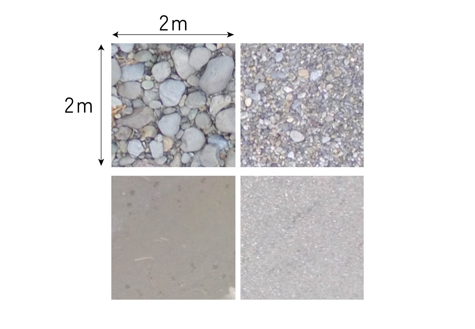 ドローンで撮影した川の空撮画像を細かく分割し、それぞれの部分がどのような材料でできているかを分類します。具体的には、大きな石(大礫)、中くらいの石(中礫)、小さな石(小礫)、砂、砂と石が混ざったもの(砂礫)など、それぞれの状態の画像を「教師データ」として作成します。この教師データは、後でモデルに学習させるための基準となるデータです。